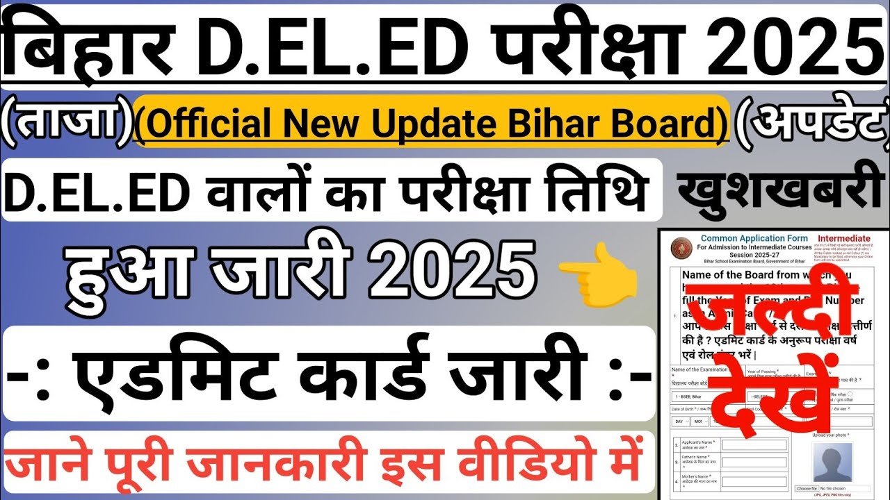 बिहार D.El.Ed एडमिट कार्ड 2025: शिक्षक बनने की ओर पहला कदम! –अगर आप बिहार में प्राथमिक शिक्षक बनने का सपना देख रहे हैं, तो आपके लिए Bihar D.El.Ed 2025 का मौका किसी वरदान से कम नहीं है। BSEB (बिहार विद्यालय परीक्षा समिति) द्वारा हर साल आयोजित होने वाली D.El.Ed संयुक्त प्रवेश परीक्षा से हजारों युवाओं को एक सुनहरा अवसर मिलता है।