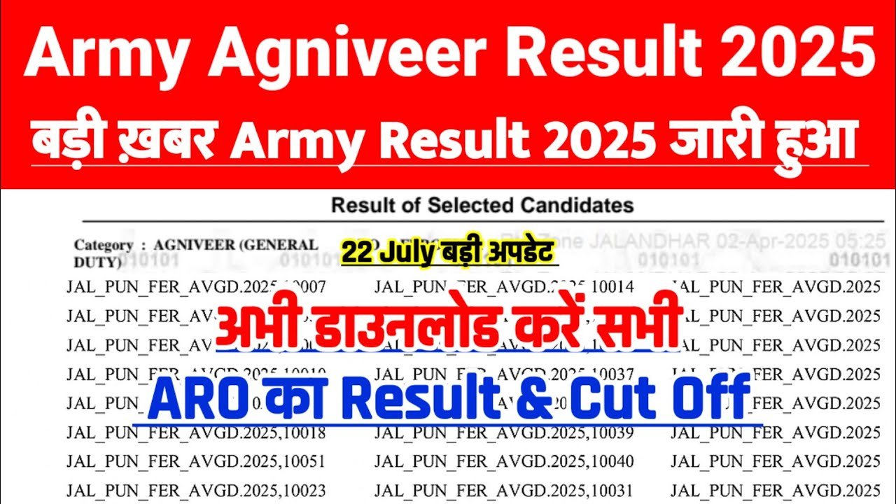 Indian Army Agniveer Result 2025 OUT-The Indian Army has officially released the Agniveer Result 2025 today, July 26, on its official website, www.joinindianarmy.nic.in. Lakhs of candidates who appeared for the written exam conducted on July 10, 2025, can now download the result in PDF format and check if they have been shortlisted for the next stages of recruitment. This detailed article covers everything you need to know about the Agniveer Result 2025 – including the direct download link, cut-off details, next steps, physical test information, and medical exam requirements.
