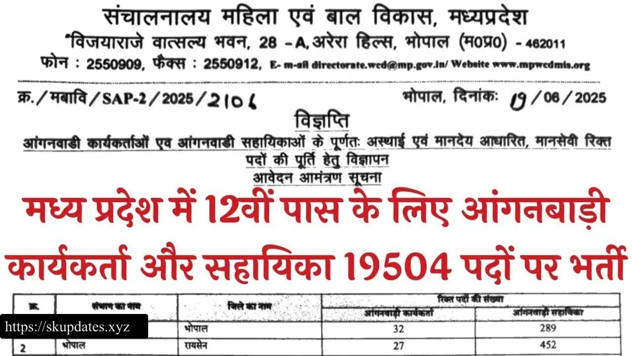 अगर आप 12वीं पास महिला हैं और सरकारी नौकरी की तलाश में हैं, तो आपके लिए यह खबर किसी खुशखबरी से कम नहीं है। मध्यप्रदेश महिला एवं बाल विकास विभाग (WCD MP) ने आंगनवाड़ी कार्यकर्ता और सहायिका के कुल 19,504 पदों पर भर्ती का नोटिफिकेशन जारी कर दिया है। इच्छुक उम्मीदवार 4 जुलाई 2025 तक chayan.mponline.gov.in पर जाकर ऑनलाइन आवेदन कर सकते हैं।